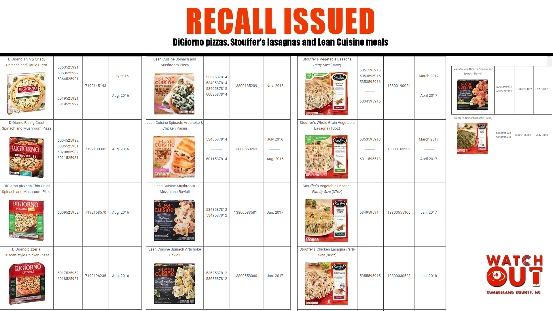 The voluntary recall is limited to the production codes listed below. To locate the production code, consumers should look on the side panel of the package. No other production codes, sizes or varieties of DiGiorno, Lean Cuisine orStouffer’s products are affected by this recall.