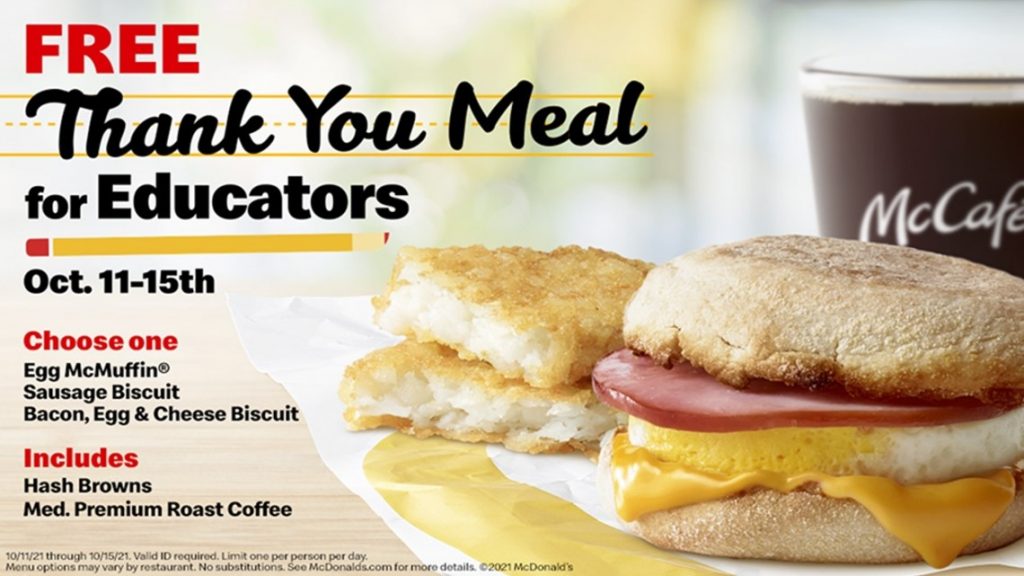 FREE McDonald’s Breakfast for Teachers from Oct 11-15, 2021