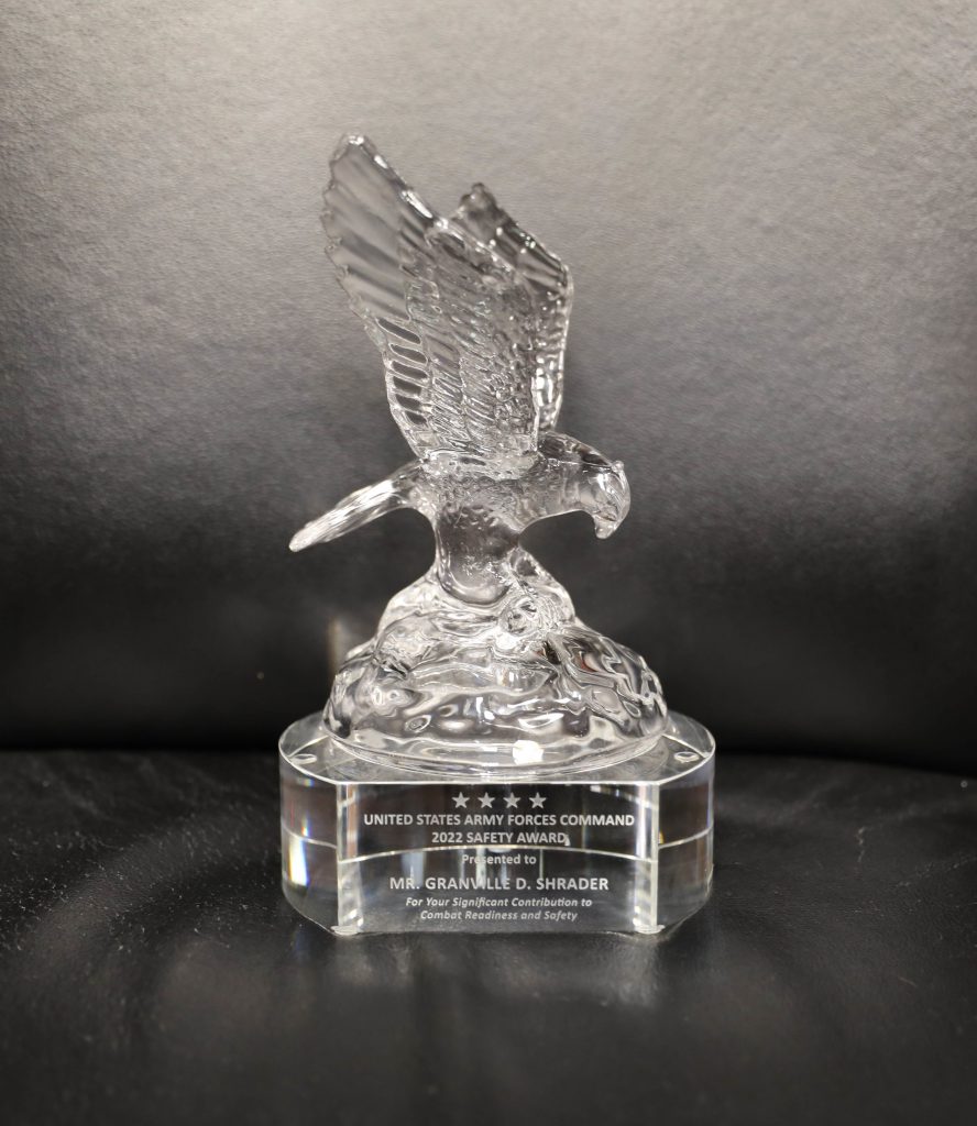 Annually, FORSCOM G1 accepts and boards Unit and Individual Safety Award Nominations with an objective panel consisting of Safety Directors and Program Managers throughout the Command to select winners of the Army Exceptional Organization Safety Award (AEOSA / 0-5 through 0-9 Level Commands) and the Army Individual Award for Excellence in Safety (AIAES) by category. FY22 nominees competed against peer organizations and represented the most outstanding of FORSCOM organizations and individuals in Safety.Gen. Andrew P. Poppas, Forscom Commander, presents safety awards to Mr. Granville D. Shrader, for his accomplishments with the most significant contributions to risk mitigation, accident prevention initiatives, hazard control measures, and safety program success, Mar. 9, 2023, Fort Bragg, N.C.