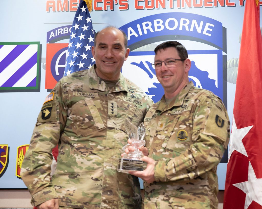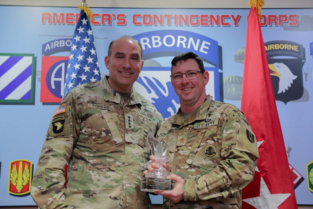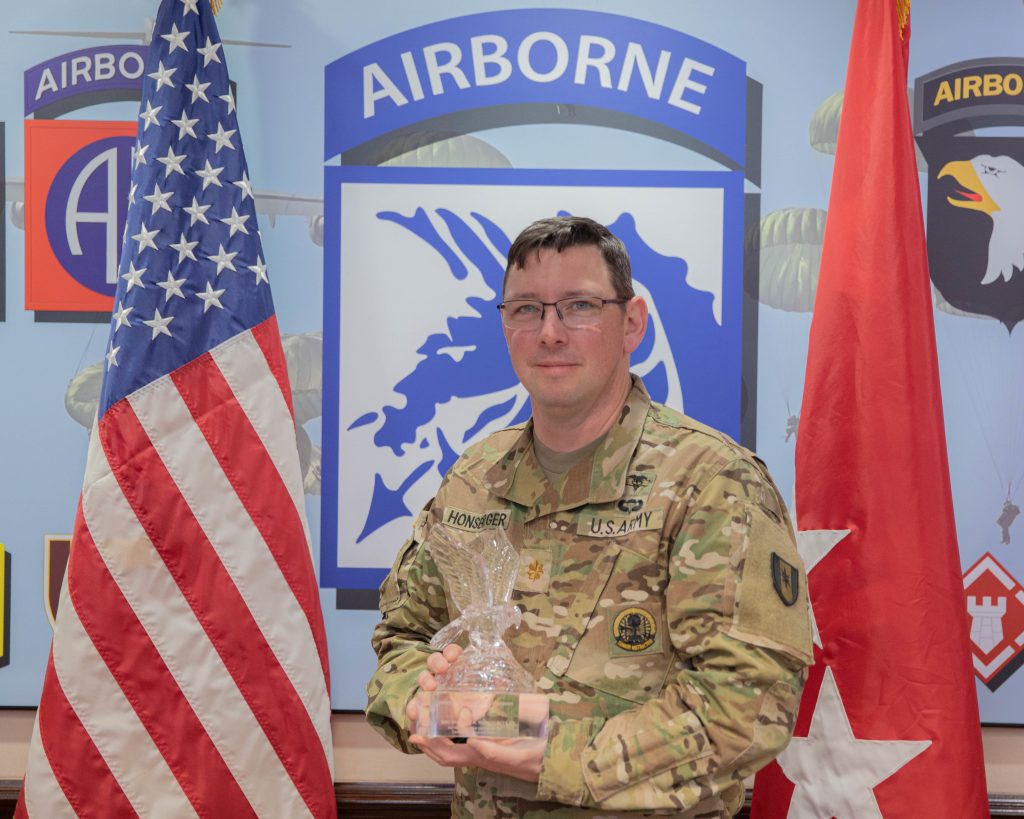 MAJ Michael A. Honsberger, poses for a picture with his award.