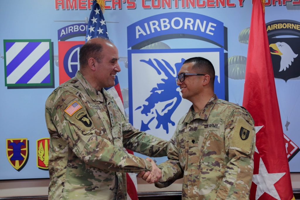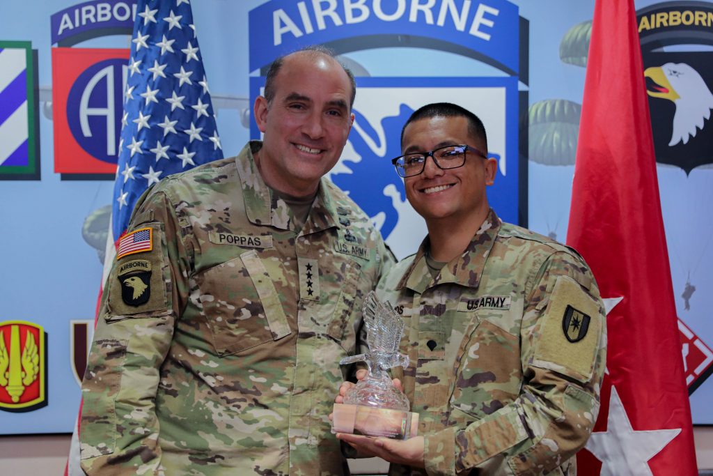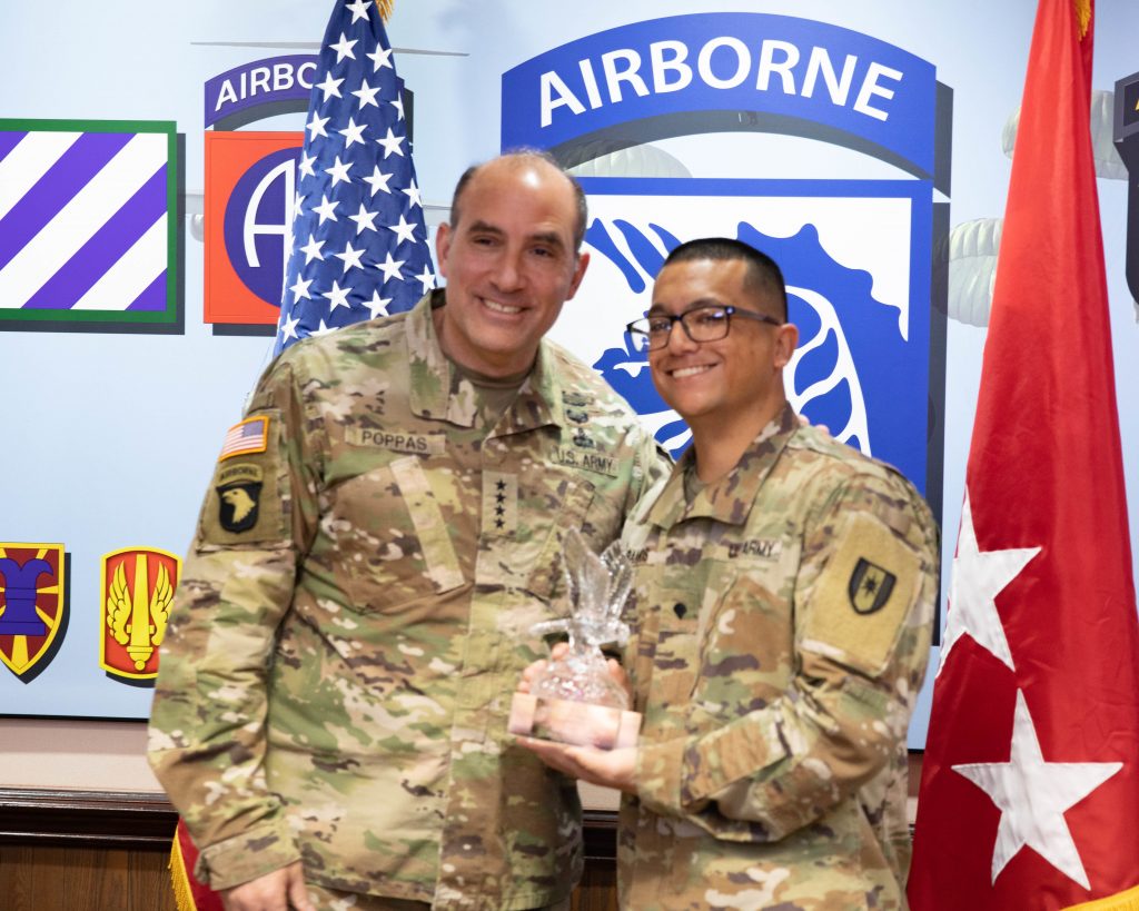 Gen. Andrew P. Poppas, Forscom Commander, presents safety awards to SPC Brian K. Ramos, for his accomplishments with the most significant contributions to risk mitigation, accident prevention initiatives, hazard control measures, and safety program success, Mar. 9, 2023, Fort Bragg, N.C.