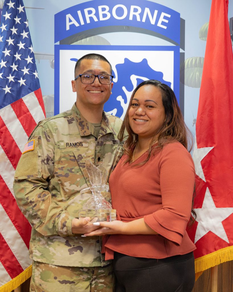 SPC Brian K. Ramos, and his wife pose for a photo with his award.