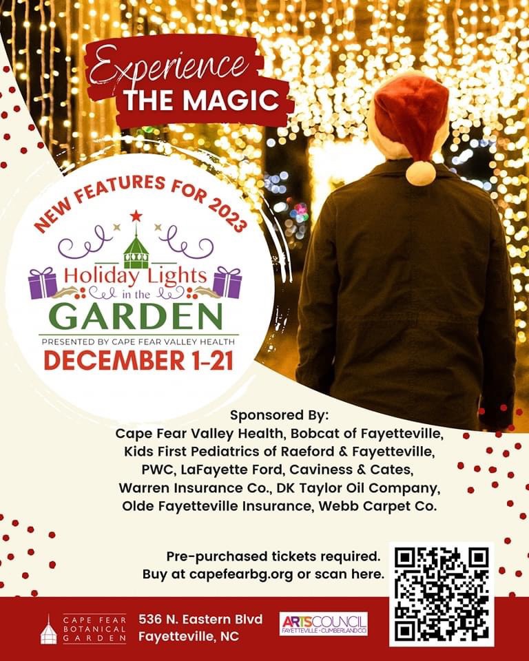 For more information on ‘Holiday Lights in the Garden 2023,’ visit www.capefearbg.org/event/holiday-lights-in-the-garden/2023-12-02/. T